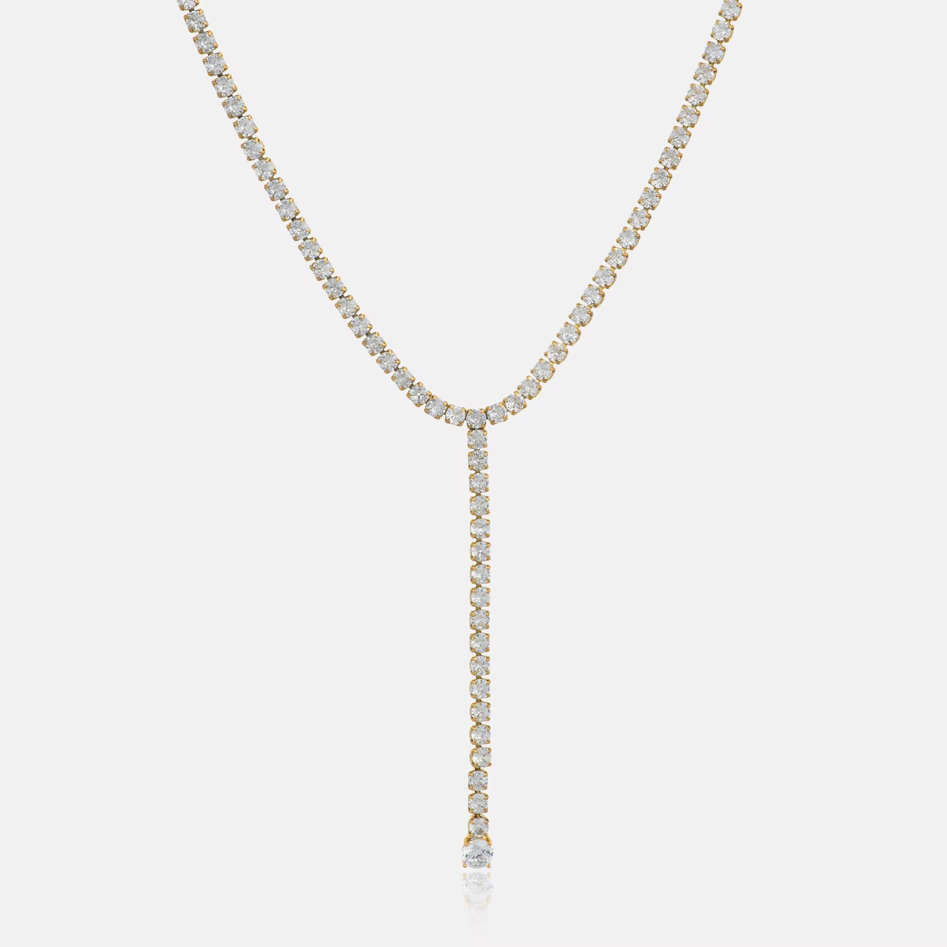 Crafted from premium stainless steel with an 18K gold plating, this Y-shaped pendant necklace combines refined geometry with understated elegance. Natural zircon stones add subtle sparkle without compromising the minimalist aesthetic. The adjustable 39+5cm length accommodates various necklines and styling preferences, making it a versatile addition to any jewelry collection. An expertly executed piece that balances contemporary design with timeless appeal.